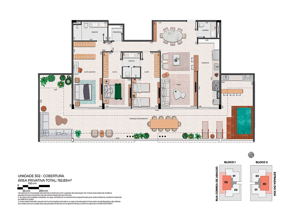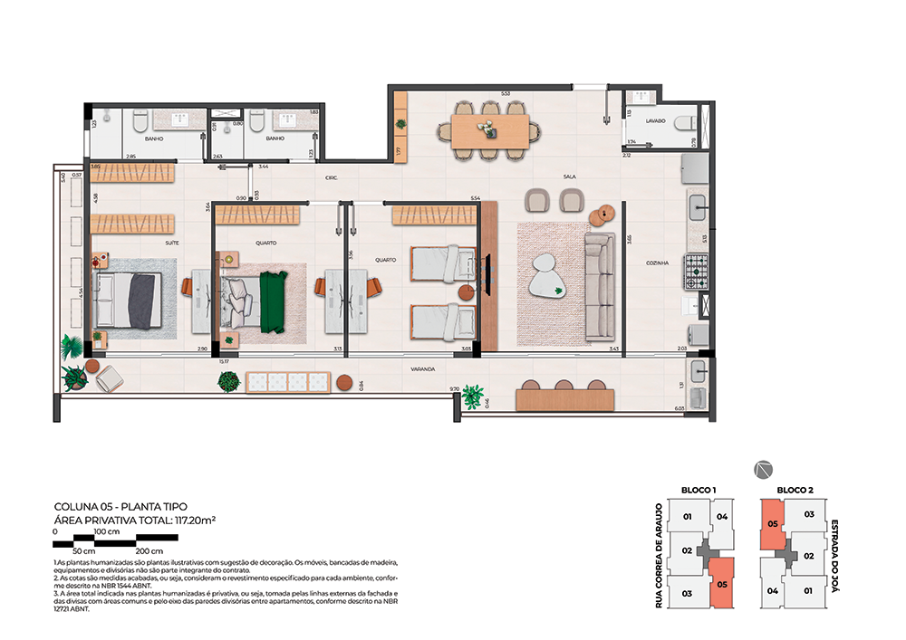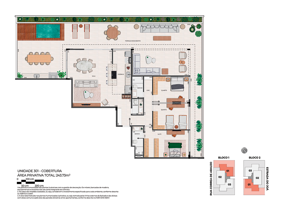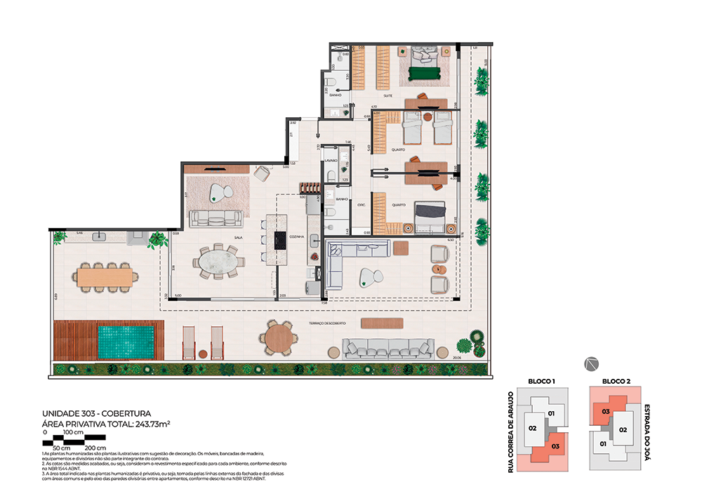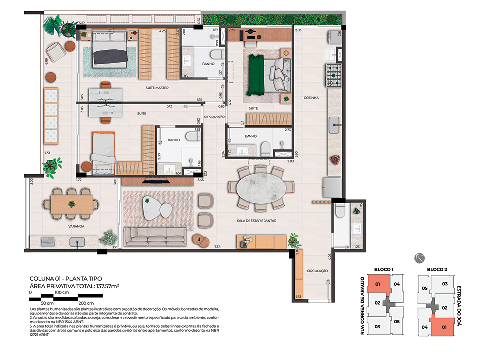 Todas as perspectivas, plantas, fotos e imagens contidas neste material publicitário são meramente ilustrativas, seus elementos de composição podem sofrer alterações de cor, forma, textura e tamanho. 2. As unidades privativas e áreas comuns do projeto serão entregues obedecendo ao projeto executivo e conforme as especificações constantes do Memorial Descritivo, que prevalecerá em caso de conflito com qualquer outro material ou informação relativa ao empreendimento, e este poderá sofrer alteração sem prévio aviso em função de posturas municipais, legais e concessionárias. 3. No interesse do bom andamento da obra, a construtora poderá substituir quaisquer especificações de material descritas neste Memorial Descritivo por similar de mesma qualidade, sempre que encontrar dificuldades em sua aquisição, a fim de evitar atraso em seu cronograma. As padronagens serão definidas de modo a obter-se harmonia e bom gosto na concretização final da unidade. 4. A decoração, iluminação, equipamentos e mobiliário das unidades privativas são apenas sugestões, não fazendo parte integrante da unidade. 5. Os equipamentos, mobiliários e elementos decorativos (quadros, tapetes, livros, almofadas, cortinas) constantes do presente material são referenciais, podendo sofrer revisão de modelos, especificações e quantidades, sem prévio aviso, não sendo entregues os utensílios, adornos e acessórios eventualmente previstos nas imagens. A incorporadora não se responsabiliza por elementos decorativos representados nas ilustrações artísticas. 6. O empreendimento será entregue com a vegetação implantada por meio de mudas, conforme especificação do projeto paisagístico. As imagens apresentadas nos desenhos, artes, perspectivas, anúncios, ou qualquer outra forma de veiculação representam artisticamente a fase adulta das espécies, que será atingida ao longo do tempo. 7. As imagens, ilustrações, plantas humanizadas, maquetes e tour virtual referentes ao empreendimento apresentados no stand de vendas, folder, material publicitário, outdoors, anúncios ou qualquer outra forma de veiculação são meramente ilustrativos, podendo apresentar variações em relação à obra final em função do desenvolvimento dos projetos executivos, da necessidade de adequações técnicas, ou do atendimento a postulados legais. 8. As vistas apresentadas nas imagens são meramente ilustrativas, podendo não retratar a realidade do local do empreendimento. 9. As unidades serão entregues com esquadrias entre os ambientes abertos e fechados, conforme projeto aprovado na Prefeitura Municipal e Corpo de Bombeiros. 10. Na planta tipo, o layout seguirá o disposto neste material como planta padrão. 11. Não serão admitidas modificações nas unidades ao longo do andamento das obras. 12. A configuração e os níveis da implantação do empreendimento estão sujeitos a alterações decorrentes de exigências técnicas e estruturais, ao atendimento das posturas municipais, concessionárias e condições do entorno. 13. As imagens de áreas privativas podem possuir configurações diferentes do padrão do empreendimento, no que diz respeito à opção de planta e acabamentos, rebaixos, sancas decorativas, mobiliários e artigos decorativos, não sendo parte integrante do contrato. Para informações sobre o padrão do apartamento, consultar o Memorial Descritivo. 14. As áreas de lazer, vias, vagas e circulação do empreendimento estão sujeitas a alterações decorrentes das exigências das posturas municipais, concessionárias e condições do local. 15. Eventualmente, para atendimento de necessidades técnicas, poderão ser executados shafts e/ou enchimentos, bem como poderão ser alteradas as posições de peças sanitárias. 16. A incorporadora não se responsabiliza pelas construções vizinhas ao empreendimento. Itens como acréscimo nas edificações existentes no entorno, aberturas de janelas, alterações de afastamentos, entre outras condições dos imóveis de terceiros podem ser verificados no local, cabendo ao Poder Público fiscalizar a regularidade das construções vizinhas ao empreendimento. 17. As informações contidas em todo material publicitário veiculado são meramente ilustrativas, não se configurando como parte de qualquer instrumento legal, podendo, inclusive, ser alteradas sem prévio aviso. 18. Memorial de Incorporação Imobiliária registrado sob o R-5 da matrícula 110849, em 11/04/2023, no 2º Ofício do Registro de Imóveis da cidade do Rio de Janeiro